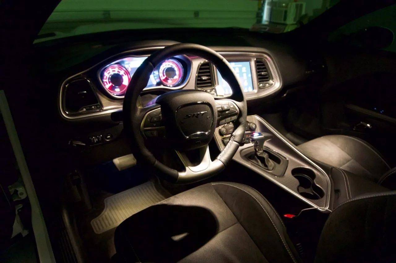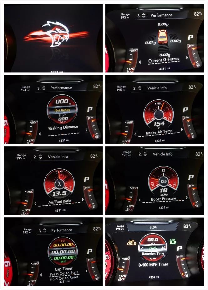 内饰方面,Hellcat版本和普通版本的车型并没有很大的差异,最能表明身份的就是:在启动的时候,仪表盘中央的显示屏会显示出“Hellcat”的标识。此外相比于其他车型,这块显示屏还可以显示engine power(功率)、engine torque(扭矩)、intake air temp(进气口温度),油气比例,boost pressure(增压压力)等等更为专注于性能的信息。