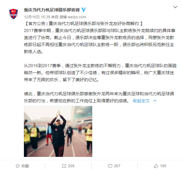北京时间12月11日,重庆当代力帆举行新闻发布会,宣布葡萄牙名帅保罗·本托将担任球队主帅,接替已经离任的张外龙率领球队征战2018赛季的中超联赛。12月10 日,重庆当代力帆发布公告宣布与前主帅张外龙经友好协商后解约。