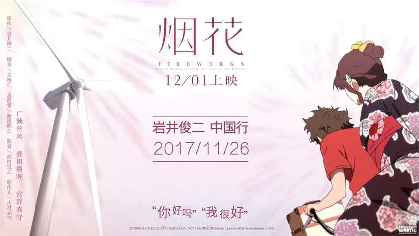 引进方光线在前期宣传上不可谓不努力,尽管早在今年9月《烟花》电影已在日本上映,不佳的观影口碑早已有了传言,但是通过邀请岩井俊二来华宣讲等活动,光线彩条屋影业依然成功炒起了《烟花》的热度,在打出“去年一起看《你的名字。》,今年一起看电影《烟花》吧”的口号后,成功将《烟花》与去年《你的名字。》相联系,可说为电影的上映做了充足的铺垫。