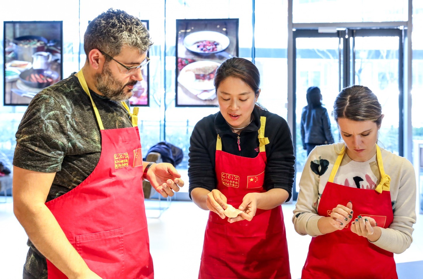 三名学生里有一男一女两个美国人,以及一个中年巴西男子,他们按照Cici的要求洗净双手又系上围裙后在烹饪台前就位,开始学做上海小笼汤包。