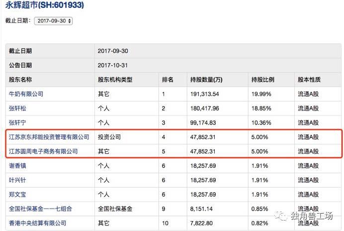 从十大股东名录上看,超过5%股份的股东仅有The Dairy Farm Company, Limited(牛奶有限公司),持有19.99%;永辉超市董事长张轩松,持有18.85%;永辉超市总经理张轩宁,持有10.36%,以及京东旗下两家公司——江苏京东邦能投资管理有限公司和江苏圆周电子商务有限公司,分别持有5%股份。