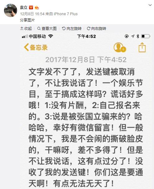 12月9日播出的最新一期也不例外。节目播出后,袁立连发数条微博,声称节目组为了制造噱头,将自己剪辑成了一个“神经病”。除此之外,她还晒出了数张微信截图,控诉节目组以保证晋级为名邀约自己,最后却遭到了淘汰,连劳务费都没有拿到。