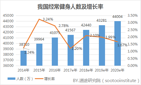 通常将一周健身3次以上定义为经常健身,统计数据显示,我国在2016年经常健身的人数达到41075万,比2015年的39964万多了1111万人次,同比增长2.78%。预计在2017年将增加492万人,达到41567万人。国务院印发《全民健身计划(2016-2020)》明确,随着群众健身意识的增强,预计在2020年,每周健身1次及以上的人数会达到7亿,经常健身的人数至少会达到4.35亿。