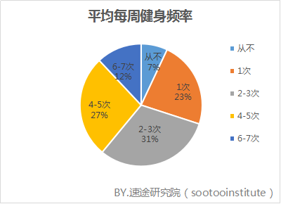 根据不同用户每周健身频率的统计发现:平均每周健身2-3次的人数最多,占全部调查用户的31%,其次为每周健身4-5次,约占27%;几乎从不健身的人仅仅占据了7%,理由大都为工作忙,没有时间去健身,或者是周围空间有限,没有足够的场地去锻炼。共享健身仓的出现,为周围场地有限、健身时间碎片化的人提供了很好的平台。