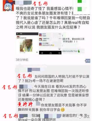 之后黄婷婷也发朋友圈,表示自己作为副队长就多拿800块钱,督促大家练舞还错了,不学拉倒。于是李艺彤马上发朋友圈回怼,关键词:“做贼心虚”、“被害妄想症”、“白莲花”。