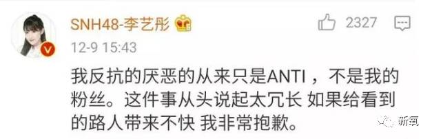 之后李艺彤也发微博解释:针对的只有ANTI(黑粉的意思),不是自己的粉丝。
