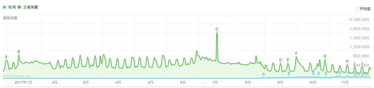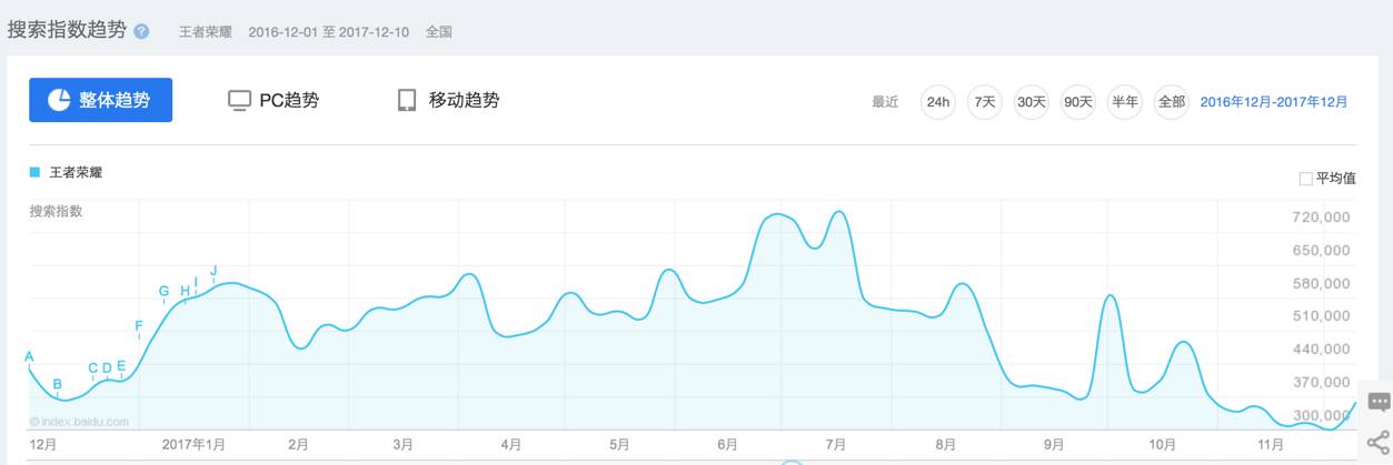 耳朵君搜索了《王者荣耀》的百度指数,发现这款现象级的游戏的确从7月达到顶峰之后,便开始不断波动下滑。下图中的波峰,分别是3月底、6月底、九月底,这三个时间段是赛季末,同时也是寒假(春节)、暑假。