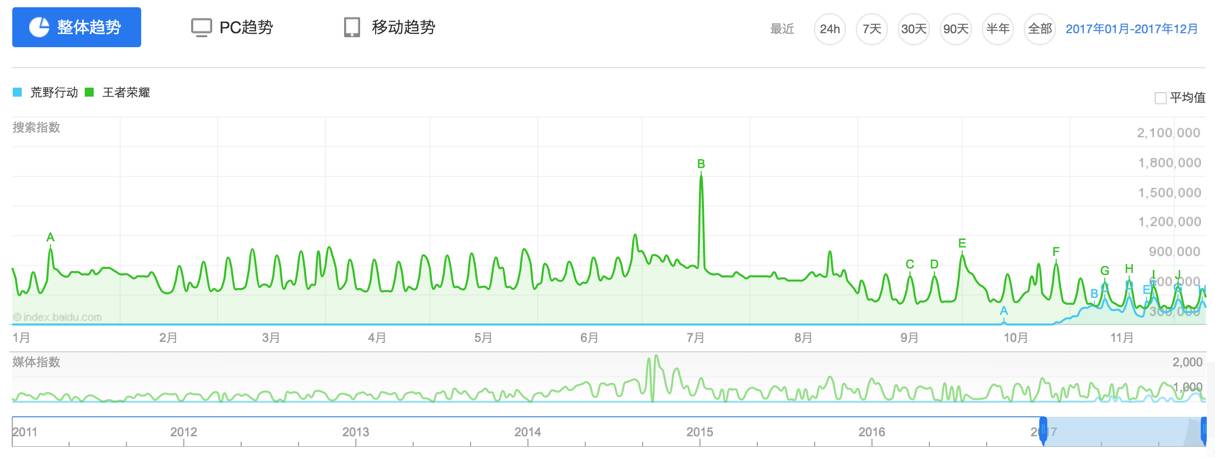 我们再来看看对王者荣耀造成最大威胁的“吃鸡”游戏。以网易的《荒野行动》为例,在10月初《王者荣耀》的关注指数出现断崖式下滑的同时,《荒野行动》关注度却在剧增。