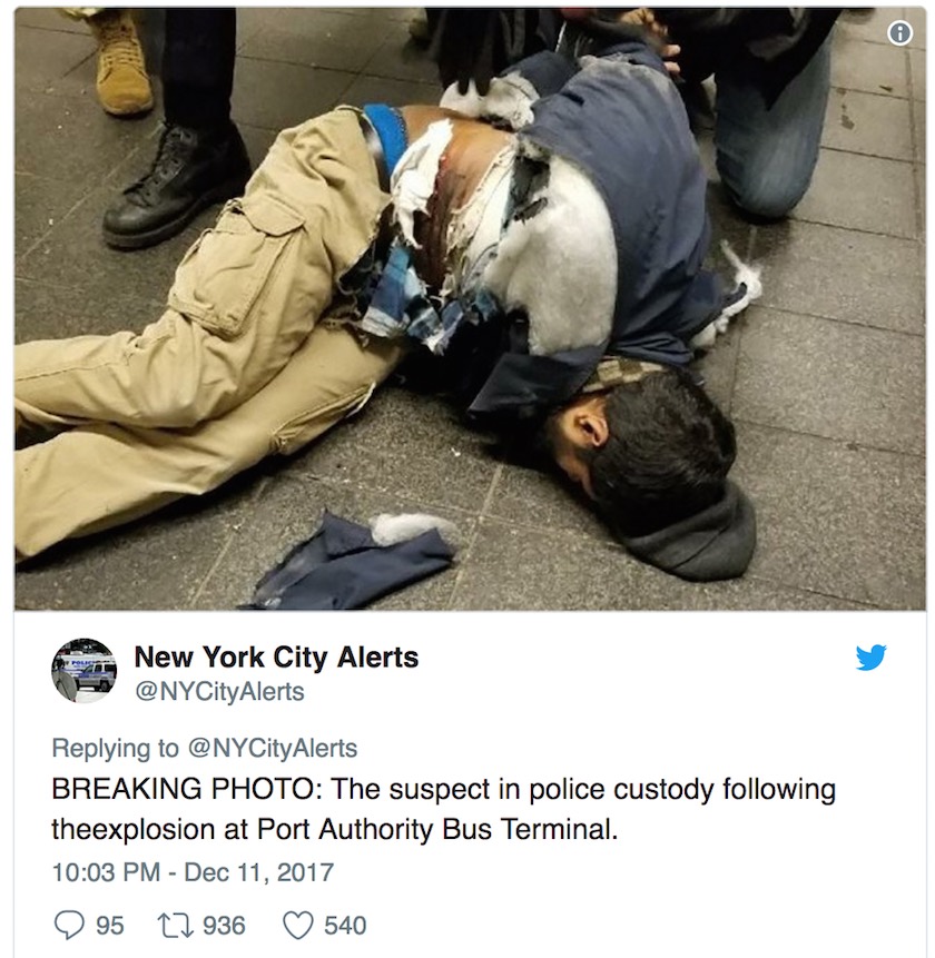 流传出的爆炸现场照片显示,一阵浓烟之后,Ullah以胎儿的姿势蜷缩在地上,衣服明显被炸碎,胸腹部裸露,呈现火烧后的焦黑色,两手被警察扣在身后。