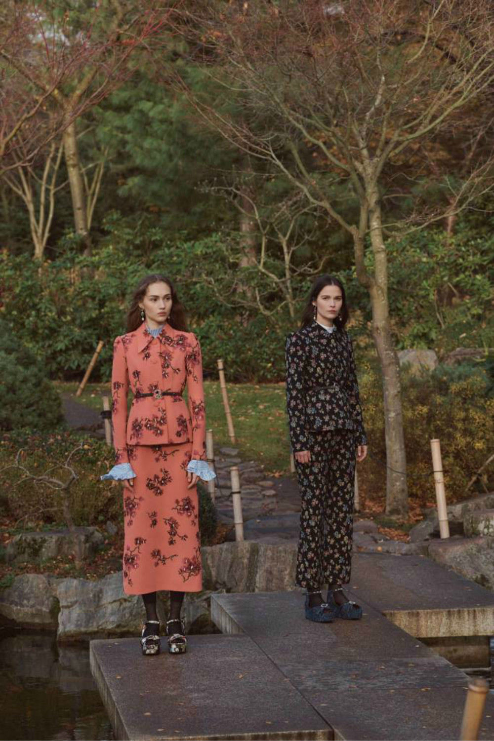 过于重复的褶边、蝴蝶结、花朵和广袖等元素通常给人以堆砌感,因此剪裁就显得尤为重要。在该系列中,设计师就用了许多细节突出纤细的腰部,比如黑色蕾丝或者腰封,更直接的是在腰部收紧呈漏斗形。用剪裁来平衡复古浪漫的做法在该系列中较为常见,比如珊瑚色的裙子套装和黑色的裤子套装,两者都饰有花朵图案,还有一件裙子用结构化的牛仔面料呈现印有浮世绘风格的鸟、树和其他自然风物。