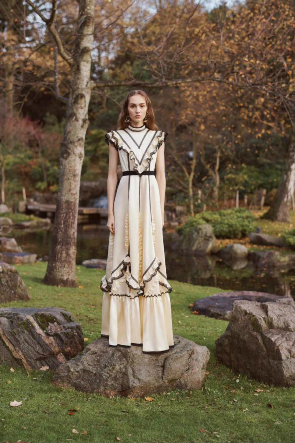 Erdem2018早春系列虽然可以看出设计师更加关注日常服装,但不得不说其中最美的还是一些小礼服,例如一条手工刺绣的鸡尾酒礼服,粉红色、蓝色和白色的玫瑰花刺绣一直从肩膀层叠到胸前,又以印花的形式遍布全身。