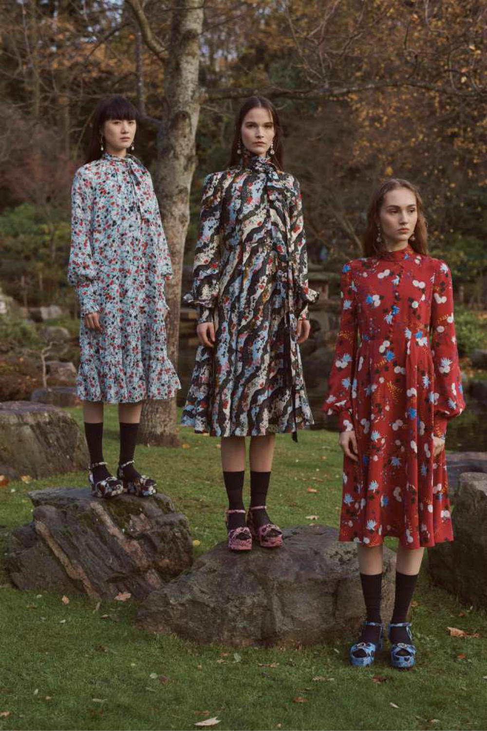 在2018早春系列中,设计师以另一英国品牌LARUA AHSLEY的浪漫、充满女人纤细感性特质的印花图案与色彩为灵感,融合了日本著名艺术家葛饰北斋的服饰绘风格, 创造了一系列优雅而又充满动感的印花图案单品。
