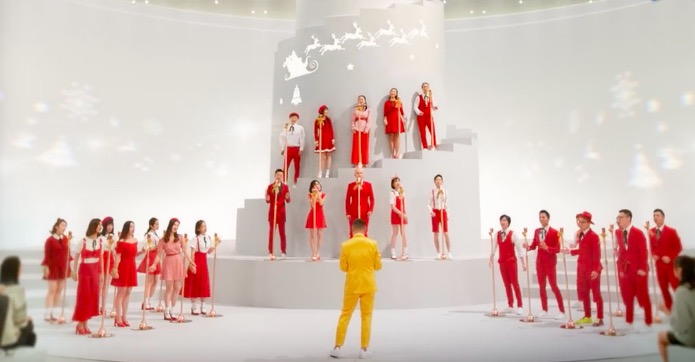 你也许已经从红白相间的画面配色和歌词里得到了一些提示。这是彩虹合唱团的又一支商业作品,合作方是肯德基——肯德基最近推出了“金色圣诞季”的营销活动,并推出了季节限定的“圣诞巨大的桶”:全家桶上印着被染成金色的榭寄生花环,桶身几乎是常规全家桶的1.5倍之大,内有新推出的热辣薯片脆皮鸡、老北京鸡肉卷、香辣鸡腿堡和巧克力慕斯蛋糕等食物,光是看看就感觉热量爆棚了。