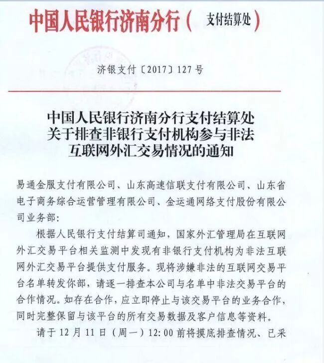 近日,中国人民银行济南分行下发通知排查非银行支付机构参与非法互联网外汇交易的情况。通知称,国家外汇管理局监测发现有非银行支付机构为非法互联网外汇交易平台提供支付服务。要求各家支付机构根据公示的名单逐一排查与非法交易平台的合作情况。如存在合作,应立即停止与该交易平台的业务合作,同时完整保留与该平台的所有交易数据及客户信息等资料。
