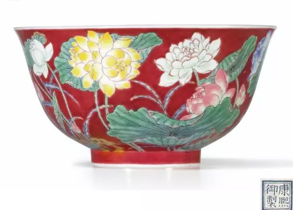 清康熙 珊瑚红地珐琅彩莲纹碗