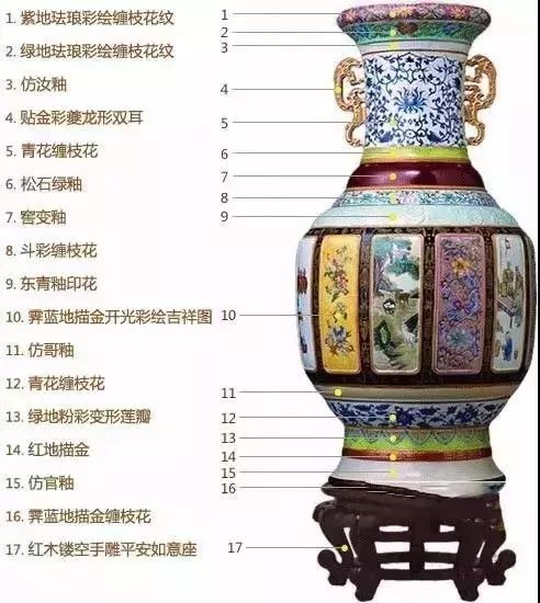 各种釉彩大瓶,也叫“瓷母”,由17种釉彩组成,是中国古代制瓷技艺的集大成者,由乾隆皇帝亲自监督烧造。