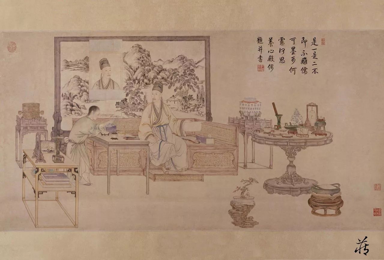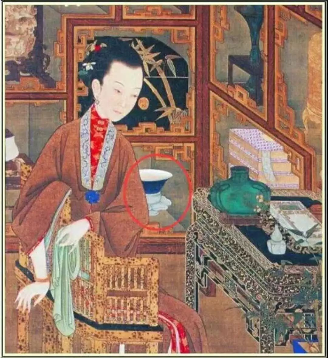 清雍正《十二美人图》之一“博古幽思”,描绘了一位面容清秀、体态纤弱的美女,身着汉服倚坐在湘妃椅上的情景,她的身后陈列着一套霁蓝釉碗和宋代青白釉盏托的组合器。