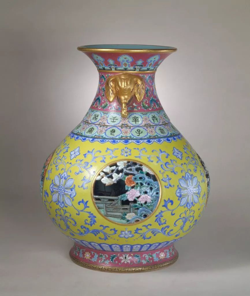 北京故宫博物院藏 清乾隆-黄地粉彩镂空干支字象耳转心瓶