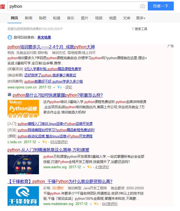 搜一下百度,跳出来的第一页中一大半都是广告,“Python培训要多久?如何快速掌握Python;Python,从入门到精通”,各种短期培训课程,看这架势百度也从Python上收了不少广告推广费。
