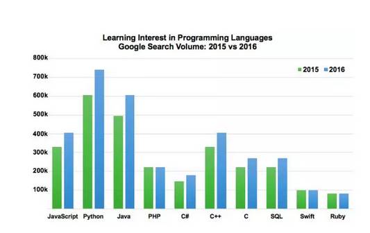 而根据谷歌去年的搜索数据,相比较2015年,用户在2016年里对Python的兴趣剧增,