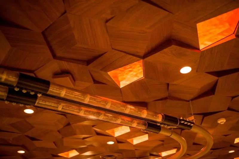 这家全球最大的星巴克把品牌创始人霍华德·舒尔茨的“文化融合”理念发挥到了极致。在使用大量黄铜、原木的基础上,这个开在上海的“烘焙工坊”加入了许多中式的设计细节:店堂中央的铜罐表面刻有1000 多个中国印章,据说上面的字符与星巴克的历史和咖啡有关;浅青玉色的茶瓦纳吧台,设计灵感来源于中国传统陶瓷茶具;吧台的正立面使用的是可循环材料,用3D 打印机连续打印,模拟中国传统阶田的造型。