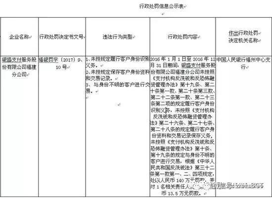 2016年1月1日至2016年12月31日期间,银盛支付福建分公司未按照《支付机构反洗钱和反恐怖融资管理办法》第十九条、第二十条第一款、第二十条第三款、第二十二条第一款、第二十三条第二项的规定履行客户身份识别义务,未按照《支付机构反洗钱和反恐怖融资管理办法》第二十六条、第二十七条、第二十八条的规定履行客户身份资料和交易记录保存义务, 未按照《支付机构反洗钱和反恐怖融资管理办法》第十条、第十九条的规定与身份不明的客户进行交易,根据《中华人民共和国反洗钱法》第三十二条第一款第一、二、四项规定,处以人民币140万元罚款,并对1名相关责任人员处以人民币13.5万元罚款。