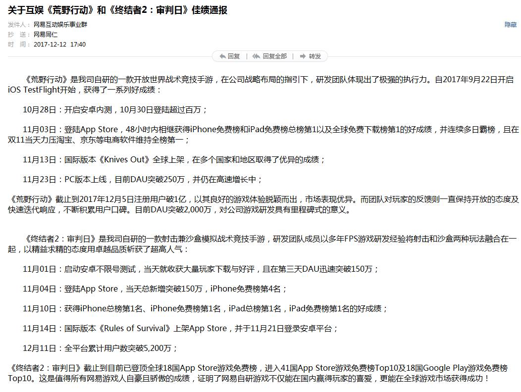 “吃鸡”手游的激烈竞争已经持续了一个月的时间,各家都投入重量级资源进行市场争夺,而就在今天(12月12日),网易游戏向内部员工发布了一封“关于互娱《荒野行动》和《终结者2:审判日》佳绩通报”的邮件,以邮件群发的形式向网易内部传达了对这两款产品近期取得成绩的鼓励,可见大厂对“吃鸡”市场的重视远比我们想象的更大。