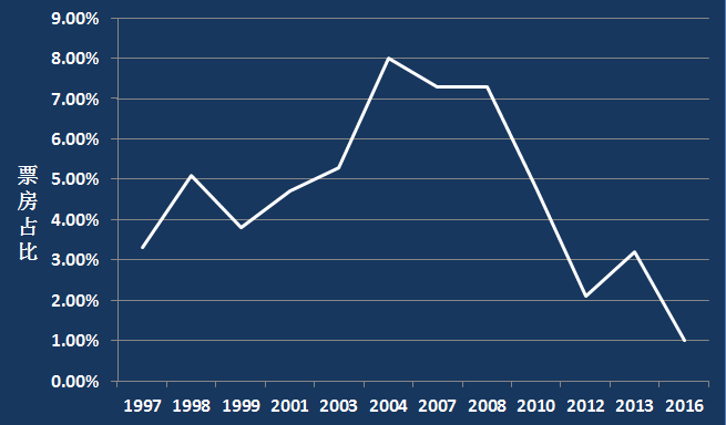受此影响,中国电影市场在90年代初期陷入了寒冬期:数据显示,1993年-2003年十年间,中国电影的票房降至80年代以来的最低水平,常年总票房不足10亿,中国观众越来越不爱进入电影院。