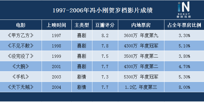 和同一时代许多“曲高和寡”的国产文艺片不同,冯氏喜剧所带有的那种市井气和观众间有着天然的联系,也让观众在选择电影时更青睐于此。壹娱观察(微信ID:yiyuguancha)统计,1997年-2006年十年间冯小刚共拍摄贺岁档影片6部,总票房3.25亿,除《甲方乙方》外均为年度票房前三,单片的平均票房占比高达5%,最高的《天下无贼》当时的票房是1.2亿,虽然这个成绩如今看起来并不起眼,但是在14年前的2004年,全年的票房才15亿,而这部影片单片票房就占到了2004年总票房的8%——8%放在2017年的电影市场,就是《战狼2》级别的电影。可以说,2007年之前冯小刚不仅是贺岁档的领军人,更是国产商业电影的一面旗帜。