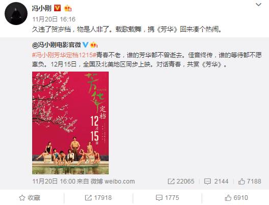 《芳华》宣布定档的那天,冯小刚发了条微博:“久违了贺岁档,物是人非了。”
