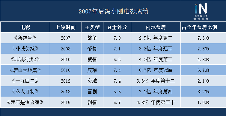 或许是离开了熟悉的领域,冯小刚不再像过去那般“得心应手”。冯小刚转型这些年,正好赶上中国电影市场爆炸式增长的那些年,10亿+的作品不断涌现,破亿已经不是什么值得炫耀的成绩了。但冯小刚非但没有趁势打造出一部10亿+的作品,单部作品的票房占比与排名反倒呈现出下降的趋势。