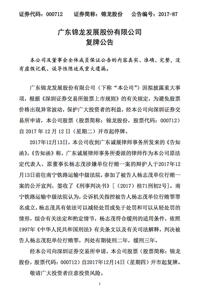 12月13日晚间,锦龙股份发布公告称,南宁铁路运输中级法院当日判决,公司原法定代表人、原董事长杨志茂单位行贿罪罪名成立,判处有期徒刑二年,缓刑三年,同时公司将于12月14日开市起复牌。