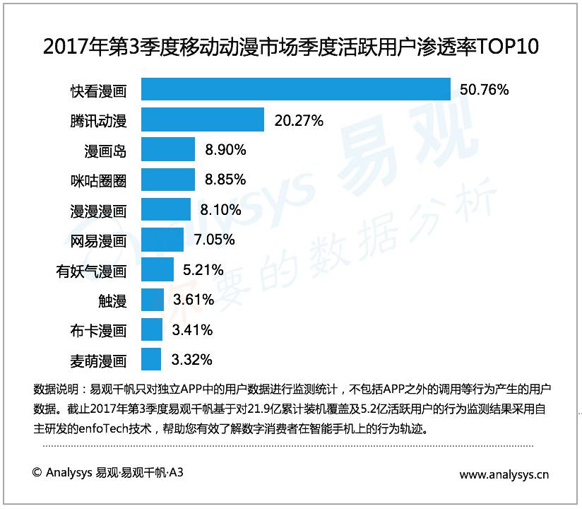 根据Analysys易观千帆监测数据,2017年第3季度中国移动动漫市场整体活跃人数达到9584.52万。整体动漫市场活跃用户渗透率排名前三的APP仍然为快看漫画、腾讯动漫和漫画岛。第一梯队中快看漫画和腾讯动漫市场基础较为稳固,变动不大。第二梯队各厂商之间差异较小,竞争激烈,各厂商需要在市场推广、优质资源获取和储备方面寻求突破。