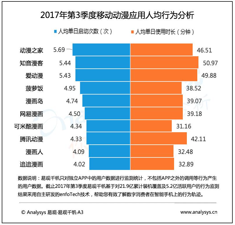 根据Analysys易观千帆监测数据,2017年第3季度动漫领域人均单日启动次数稳定在4-6次,人均单日使用时长仍稳定在30-50分钟之间,行业均值变化差异不大。其中,动漫之家和爱动漫表现稳定,长期稳居榜单前列,3季度,知音漫客APP进行版本升级,版本更新频次加快,在用户挑选漫画时、观看漫画中和看完后三个阶段优化产品功能,使产品更加贴合用户使用习惯,用户活跃频次和粘性均有所增加,挤身榜单TOP3。知音漫客移动APP从2017年1季度开始重返市场,1季度和2季度重点在于提升平台作品规模、完善应用基础功能。3季度市场重点在于优化用户使用体验,因此用户粘性有所提升。