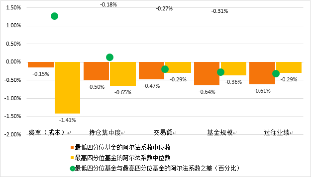 下图展示了相关结果,重点是考察最低四分位基金的阿尔法系数与最高四分位基金的阿尔法系数之间的差。差值越大,就越能说明这些指标在区分阿尔法系数处于不同水平的基金时的作用。我们发现,成本(费率)是五项指标中阿尔法系数差值最大的指标。