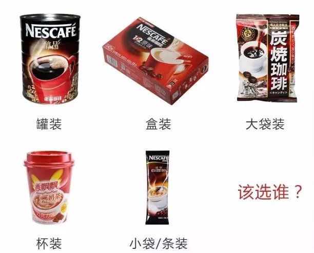目前的市场上,主要有5种形式的包装:罐装,盒装,大袋装,杯装,小袋/条装。