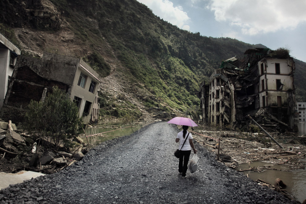 从前的北川公园现在是一片汪洋。地震引起的山体滑坡和接踵而来的两次泄洪只给这里留下一栋危楼,那是原来的北川发电站。歪斜的楼体上,洞开的窗口如正在呐喊的嘴巴,让人心里憋闷。每逢初一十五,政府会安排专车拉板房区的居民来北川遗址烧纸、祭拜。
