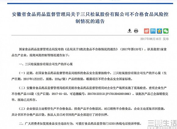 而另一边,三只松鼠的产品也陷入了“霉菌超标”的风云中。8月15日,食药监总局通报三批次食品不合格,其中包括京东某食品专营店,三只松鼠,沃尔玛。但微博很快就大面积爆出三只松鼠开心果霉菌超标”的话题,对另外两家却不怎么理睬。虽然说食品安全没有把好关是三只松鼠不对,但就目前传播的效果来看,三只松鼠在这次事件中明显处境最为不利,真可以说是成也“网红”,败也“网红”。