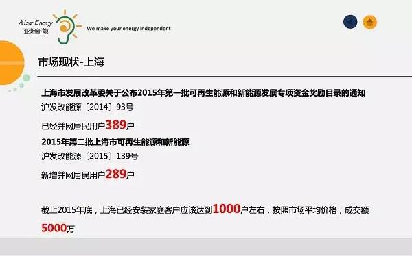 我们可以看一下这个数据,我们可以从上海市发改委的官网可以看到,今年已经出台了三份可再生能源和新能源专向基金的补充通知。截至今年第一季度,上海并网用户已经389截止6月份新增并网用户达289户,可以预计截止到2015年底已安装1000户。此1000户预计平均每家安装5个千瓦,每瓦按照10元的平均价,上海今年的市场可达5000W的销售额。
