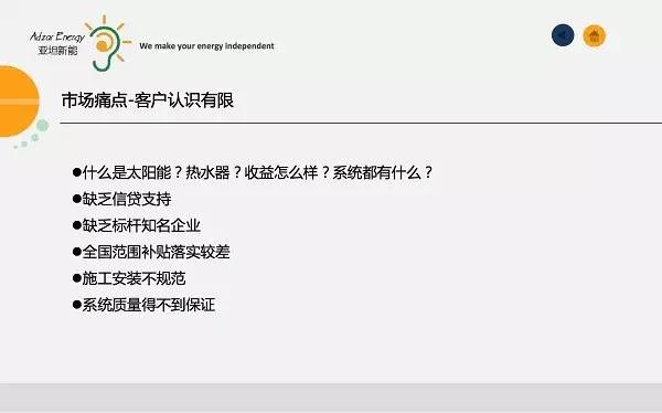 第三,缺乏标杆和知名企业。南方汉能知名度大于英利,而汉能在终端上做的并不够好。导致整个市场环境比较乱。客户认知不清晰