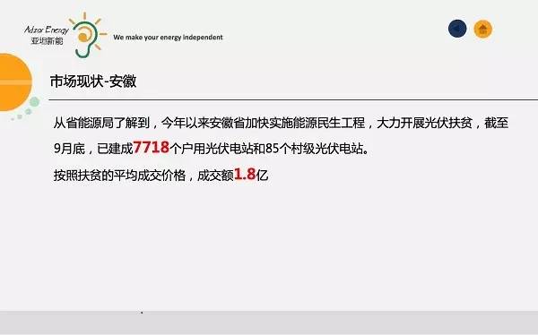 我们再看安徽的市场现状,截止九月底,安徽已经建成的户用发电达到7718个,按照今年光伏扶贫的平均价,市场达到1.8亿,是上海市场的三倍。