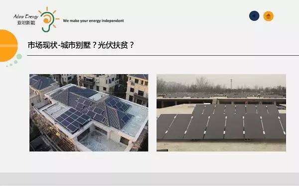 这是我今年做的两个典型项目,左边是别墅家庭屋顶做的,一共8.5KW的系统,右边是在河北曲阳与汉能合作的光伏扶贫的项目。城市别墅相对来讲做得好的还是经济发达城市,客户对新能源理念接受能力强,成交价也比较高。农村扶贫特点,一般不是由农民自发组建,一般是由光伏企业联合当地合作伙伴成片开发。方式为他人投资,国家补贴,分享屋顶租赁收益。