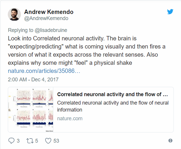 实际上,包括Happy Toast在内的诸多推特用户都准确地推断出了这一现象的缘由。人们听到动图里的声音很大程度上是因为画面的晃动。这其实被称之为“视觉诱发听觉反应”,又称“vEAR”。“我们的周围充斥着不断发出声响的运动物体,比如人们走路的脚步声、说话时嘴唇摩擦发出的声音、操场里球落地的声音,亦或是打碎玻璃杯时发出的声音,”Fassnidge这样解释道,“有研究表明人们在婴幼儿时期就学会了共感觉。有时候人们以为自己听到了街对面的行人的脚步声,但其实那个声音只存在于人们自己的脑海里。”