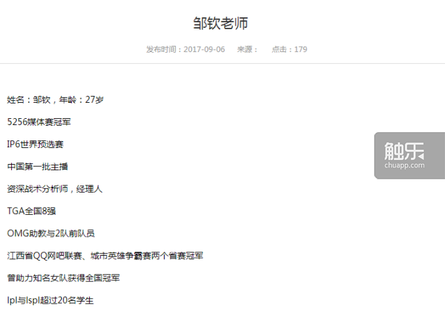 也许他真的很忙,我是在第二天见到他的,因为第一天的时候,接待老师没法联系到他。邹钦先生的身份是“蓝翔电竞负责人”,但在王老师的介绍中,他只是”电竞专业的老师”。不管怎么说,他毕竟是我在蓝翔见到的唯一一个和电竞专业有关的人。而且,在蓝翔电竞学院官网“师资团队”一栏的所有人里,邹钦唯一拥有个人简介。他的介绍是:“5256媒体赛冠军、IP6世界预选赛、中国第一批主播、资深战术分析师、TGA全国八强、OMG助教与2队前队员、曾助力知名女队获得全国冠军、LPL与LSPL超过20名学生”。在侵权使用电竞女主播MISS照片用作宣传并被批评后,蓝翔对电竞学院官网进行了改版,有关教师的具体介绍资料都已经被删除。