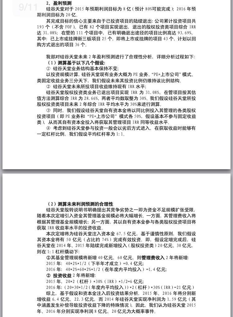 李平向界面新闻记者提供了此份《硅谷天堂企业情况与投资价值分析》。其中提及:硅谷天堂对于2015年预期利润为8亿元,2016年预期利润目标为20亿元。基于假设和资本金注入后投资结果分析,基金管理人认为实现上述净利润为大概率事件。并在总结中表示:站在新三板市场预期发展良好,PE行业面临较大发展机遇的大背景下,本项目收益预期较好。