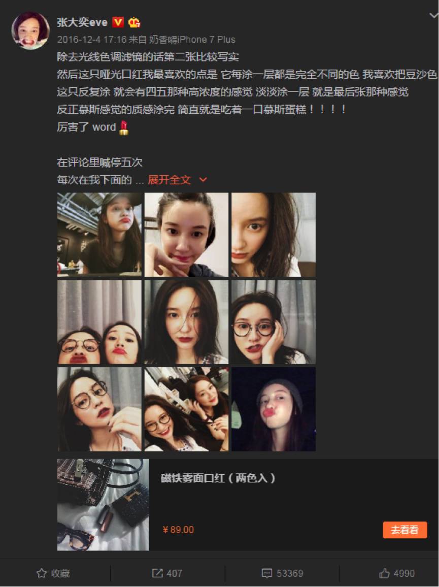 正如张大奕在上线美妆店铺、打造自己的彩妆品牌之前,就不间断地在微博中向粉丝介绍自家口红产品上架前的经过,包括产品的原材料及供应商。几乎每有一步新进程,都会在微博中介绍。