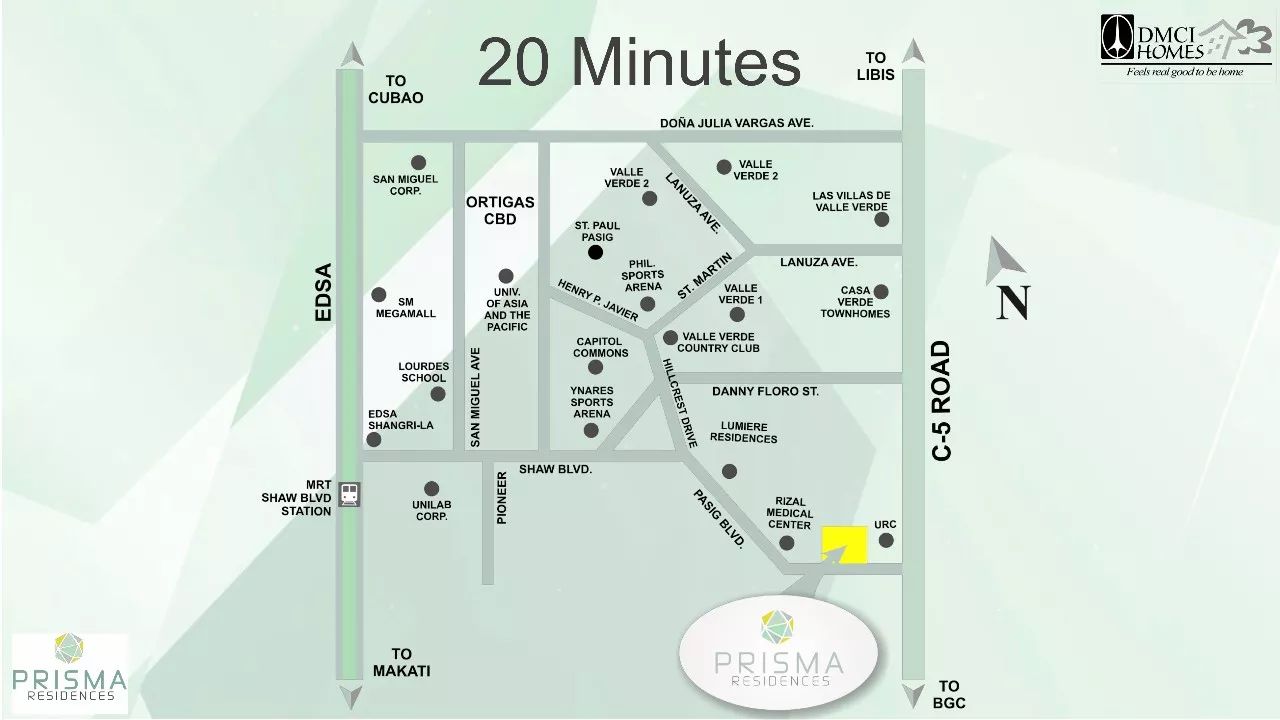 Prisma 项目位于马尼拉两大中央商务区 BGC 和 ORTIGAS 形成的三角地带的中心。附近2公里以内有菲律宾电视五台、大量的 BPO 写字楼、医药研究所等优质潜在业主或租客。同时,项目所处地势高,没有水患,这里到C5路边不到100米的距离,高于C5的落差有十多米。
