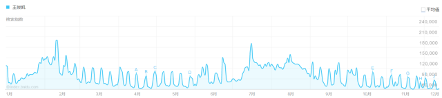当然,这其中最为亮眼的莫过于王俊凯。从百度指数的变化趋势可以看出,今年1月TFBOYS登上《春晚》舞台,加上王俊凯参加北京电影学院艺考后,关注度达到了一个高峰,随后4月播出的《高能少年团》却并没有带来期望之中的流量。6月高考过后,TFBOYS主演的青春偶像剧《我们的少年时代》与TFBOYS四周年给王俊凯带来了今年持续最久的流量高峰。