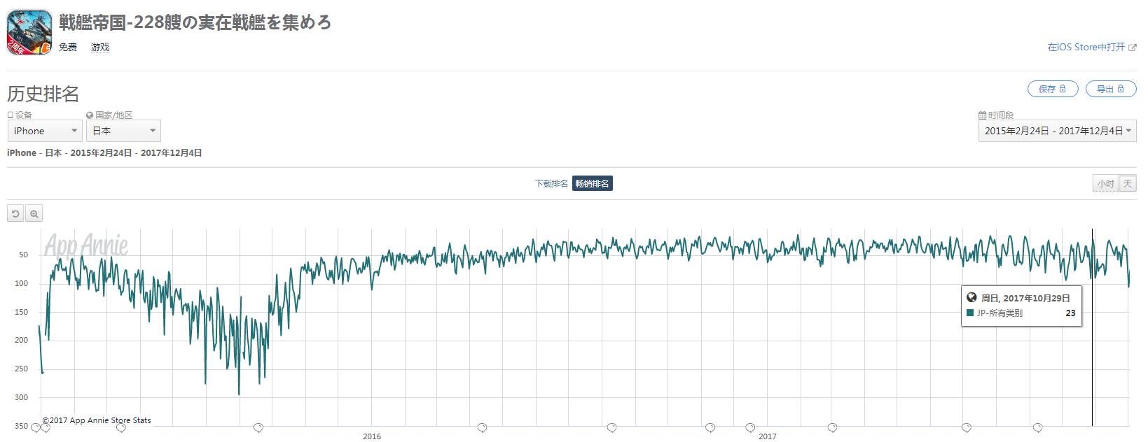 虽然在韩国、欧美等市场中也都有不错的表现,但是《战舰帝国》最大的收入来源无疑还是日本市场。其实《战舰帝国》在日本市场也并非“一帆风顺”。在上线半年后,游戏的收入有了明显的下滑趋势,随后奇酷工场通过广告、运营组合将其重新拉升到推广初期的高度。例如在2015年引入了“大凤”、“千代田”等日本玩家熟悉的二战传奇战舰;在2016年投放了14个日本热门综艺节目电视广告等等。