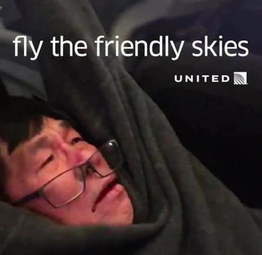 搜索量排第二的表情包就没那么轻松了。它来自今年4月的美联航暴力殴打亚裔乘客、强迫其下机的事件,有网友在满脸是血的亚裔乘客照片中配上了美联航宣传语“友好飞行(fly the friendly skies)”,格外讽刺。